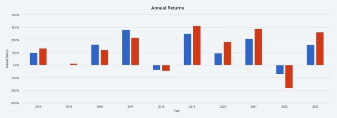 In case you’re wondering how the returns of the Dow have compared to the returns of the S&P 500, here is how each has performed over the last 10 calendar years. The Dow is in blue, the S&P 500 is in red (chart from www.portfoliovisualizer.com).