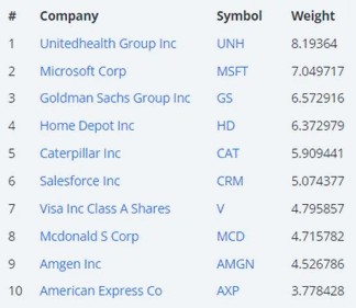 The Dow is currently made up of 30 stocks, where the top 10 and their respective weights are (as of March 21, 2024, “Weight” is in percent. Table from www.slickcharts.com):