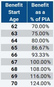 Below is a summary of the reductions from PIA, or increases to PIA, to starting your Social Security retirement benefits at an age other than your FRA. This chart assumes you were born in 1960 or later, thus your FRA is age 67.